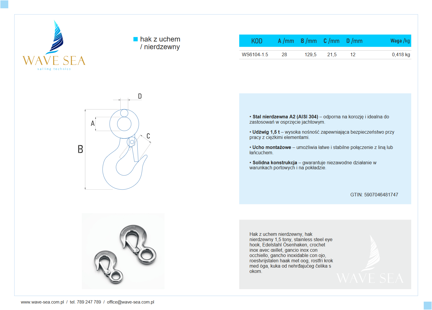 Hak z uchem nierdzewny 1,5 t to połączenie trwałości, funkcjonalności i precyzyjnego wykonania, zapewniające bezpieczeństwo i wygodę użytkowania na każdej łodzi. Wave Sea – solidność i precyzja wykonania.