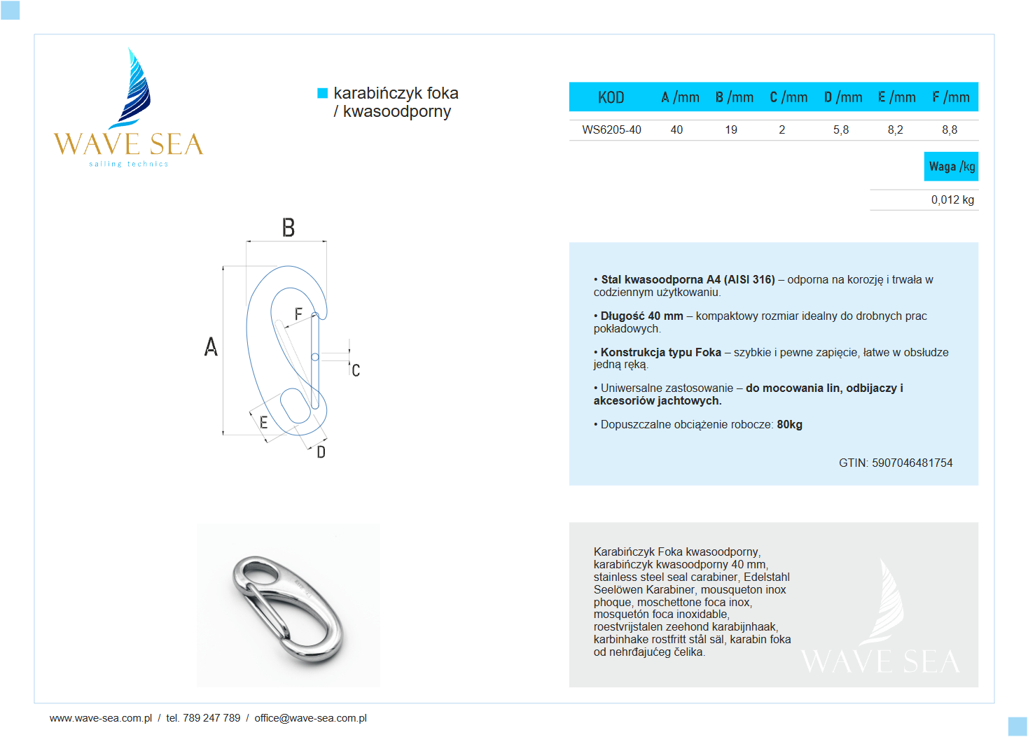 Karabińczyk Foka kwasoodporny 40 mm łączy funkcjonalność, wygodę i solidne wykonanie, zapewniając niezawodne działanie w codziennym użytkowaniu na jachcie. Wave Sea – solidność i precyzja wykonania.