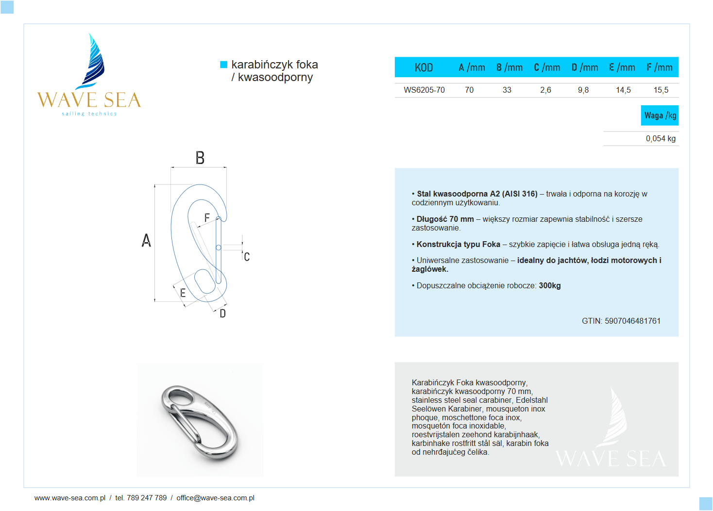 Karabińczyk Foka kwasoodporny 70 mm to połączenie funkcjonalności, solidności i eleganckiego wyglądu, które sprawdzi się w każdym zastosowaniu pokładowym. Wave Sea – solidność i precyzja wykonania.