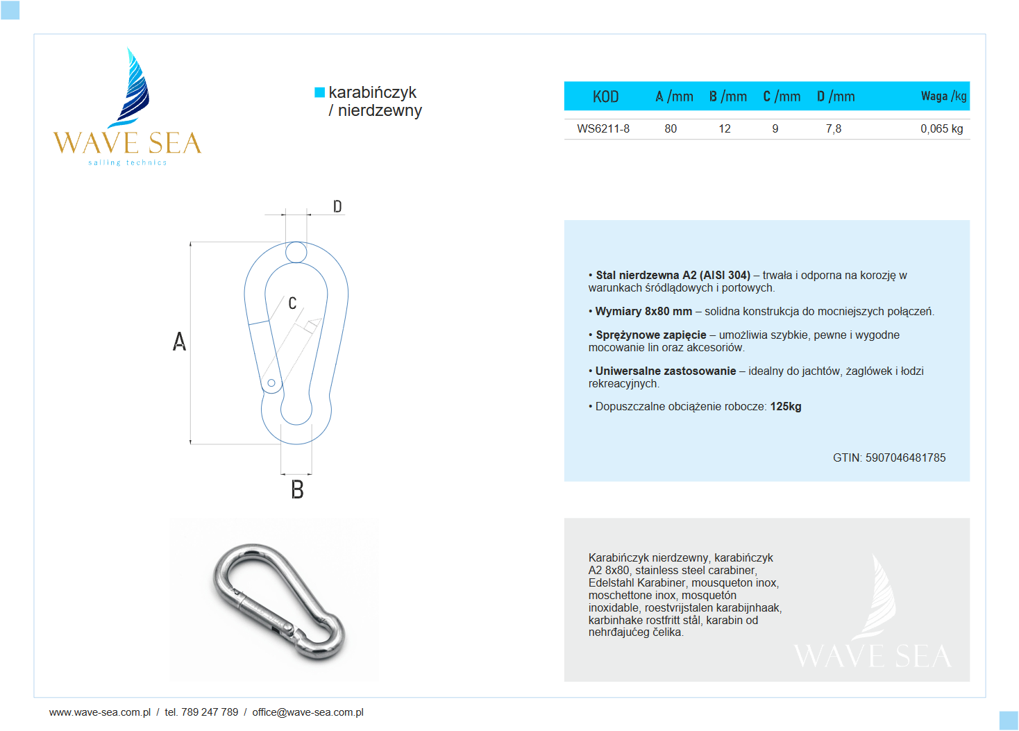 Karabińczyk nierdzewny A2 8x80 łączy trwałość, funkcjonalność i prostotę obsługi, gwarantując pewne mocowanie w każdej sytuacji. Wave Sea – solidność i precyzja wykonania.