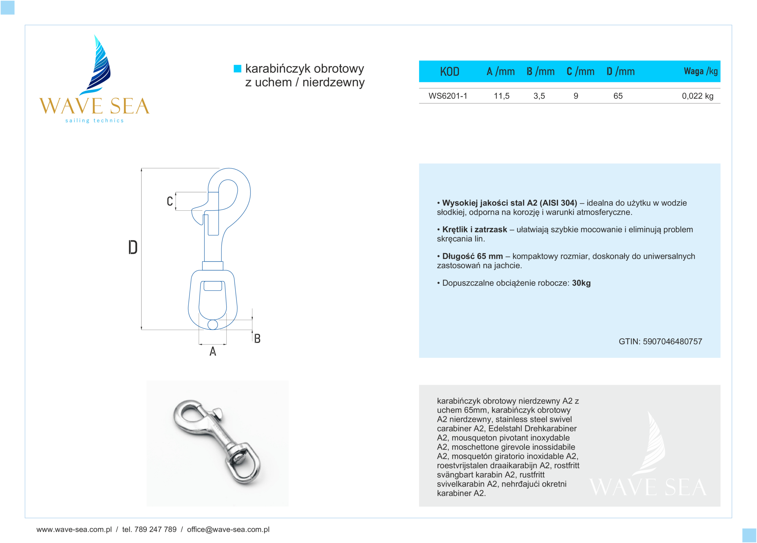 Karabińczyk obrotowy nierdzewny 65 mm to funkcjonalny i trwały element osprzętu żeglarskiego, stworzony z myślą o użytkownikach łodzi i jachtów. Wykonany ze stali nierdzewnej A2 (AISI 304), jest idealny do środowiska słodkowodnego, oferując wysoką odporność na korozję. Wyposażony w krętlik i zatrzask, zapewnia szybkie, pewne mocowanie oraz możliwość swobodnego obracania pod obciążeniem.