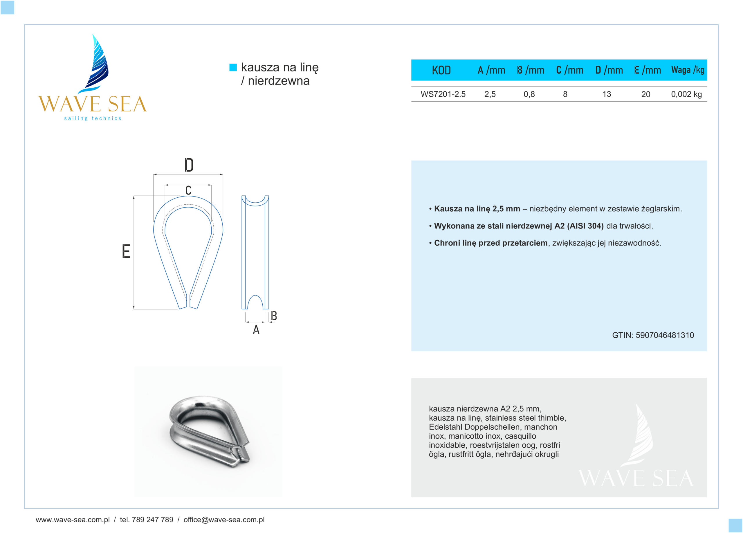 Kausza na linę o średnicy 2,5 mm to mały, ale niezwykle ważny element w każdym zestawie żeglarskim. Wykonana ze stali nierdzewnej A2 (AISI 304), skutecznie chroni linę przed przetarciem, zapewniając jej długowieczność i niezawodność.