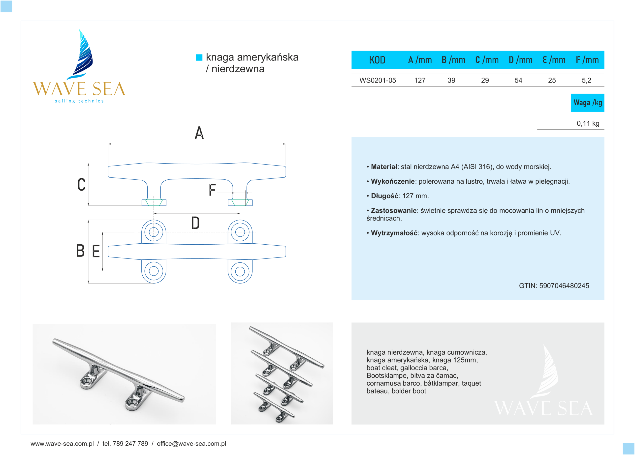 - Materiał: stal nierdzewna A4 (AISI 316), do wody morskiej.