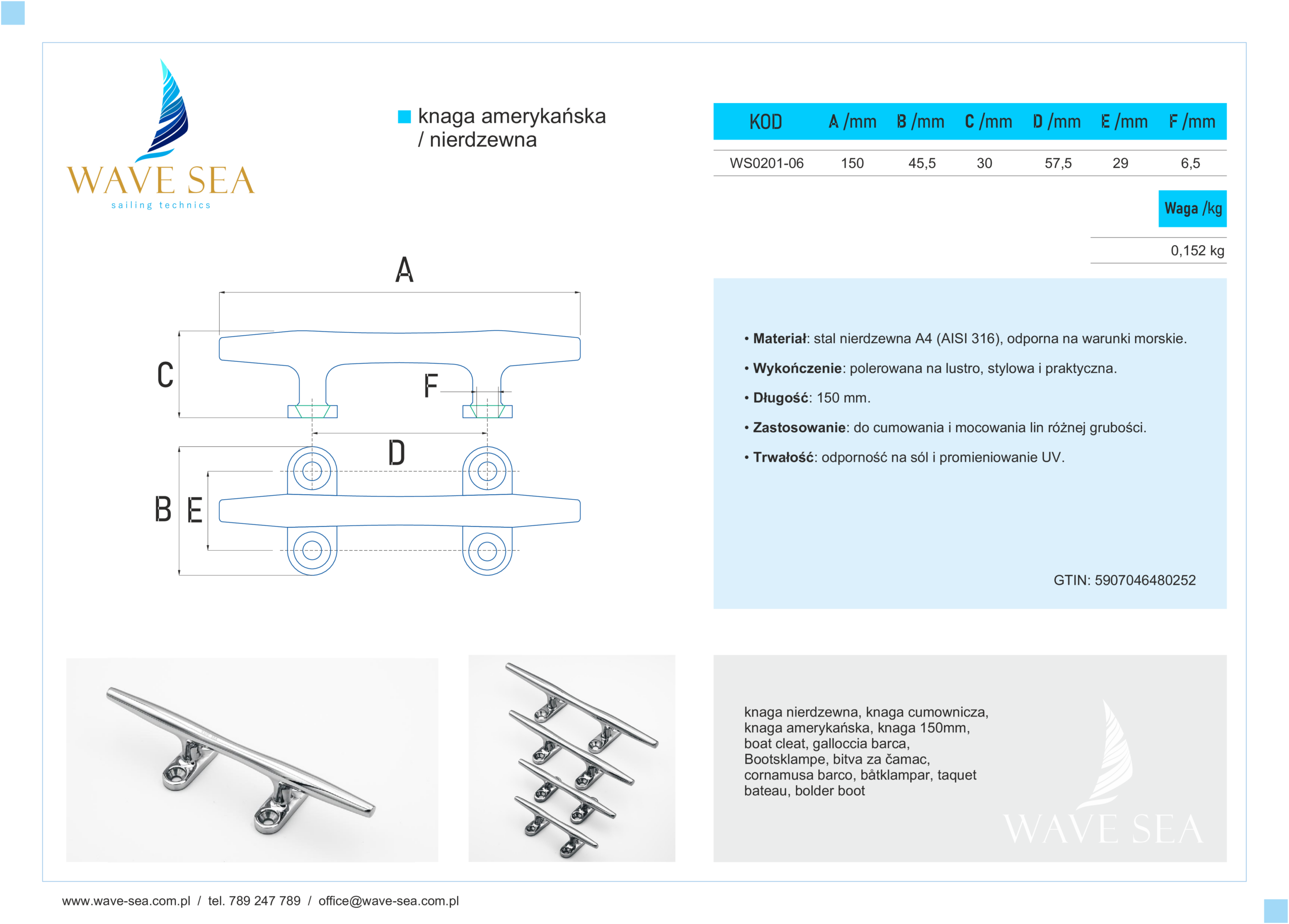Dzięki precyzyjnej konstrukcji knaga zapewnia szybkie i pewne mocowanie lin, a polerowane na lustro wykończenie nadaje jej elegancki wygląd.