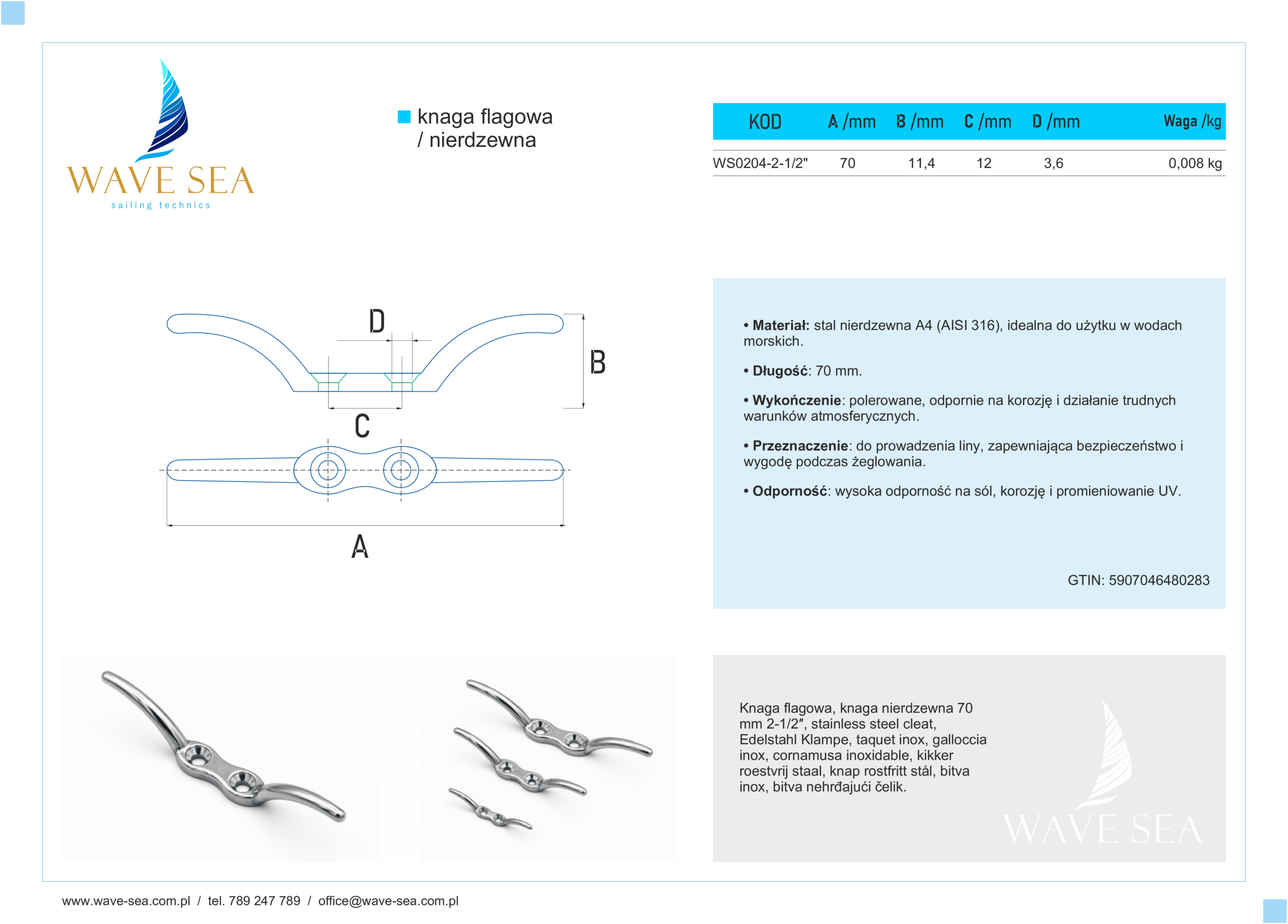 - Materiał: stal nierdzewna A4 (AISI 316), idealna do użytku w wodach morskich.