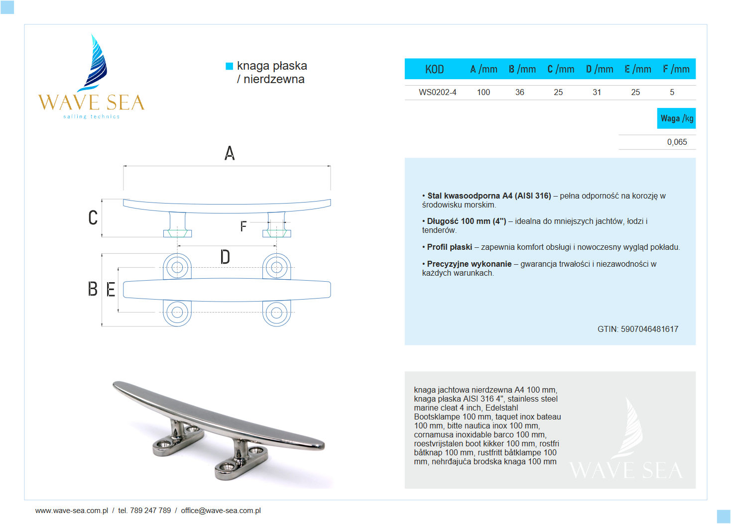 Knaga płaska kwasoodporna 4" 100 mm to połączenie elegancji i funkcjonalności, które podnosi bezpieczeństwo i estetykę każdej jednostki. Wave Sea – solidność i precyzja wykonania.