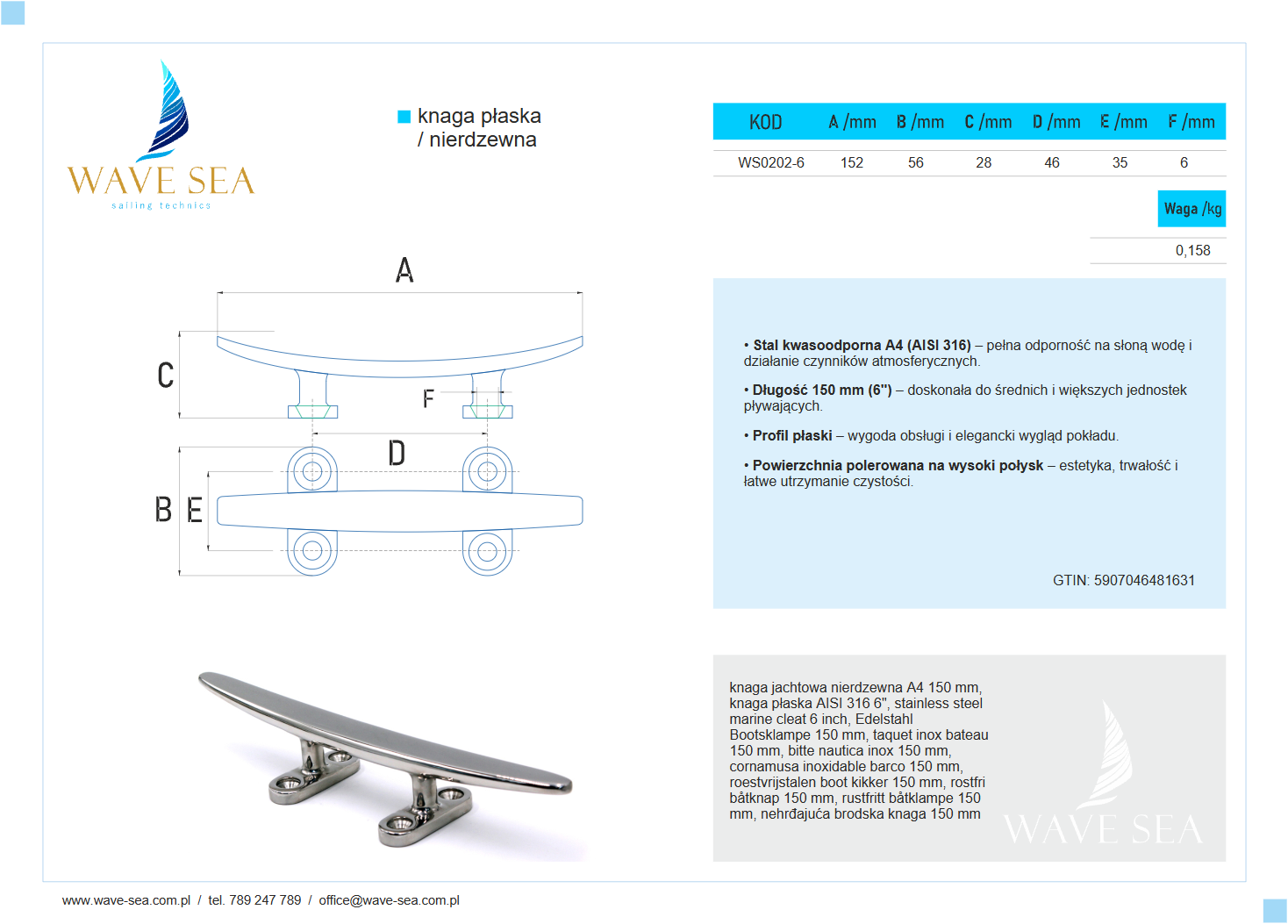 Knaga płaska kwasoodporna 6" 150 mm to połączenie solidności, funkcjonalności i nowoczesnego designu, które podnosi komfort oraz bezpieczeństwo na każdym jachcie. Wave Sea – precyzja i niezawodność w każdym detalu.