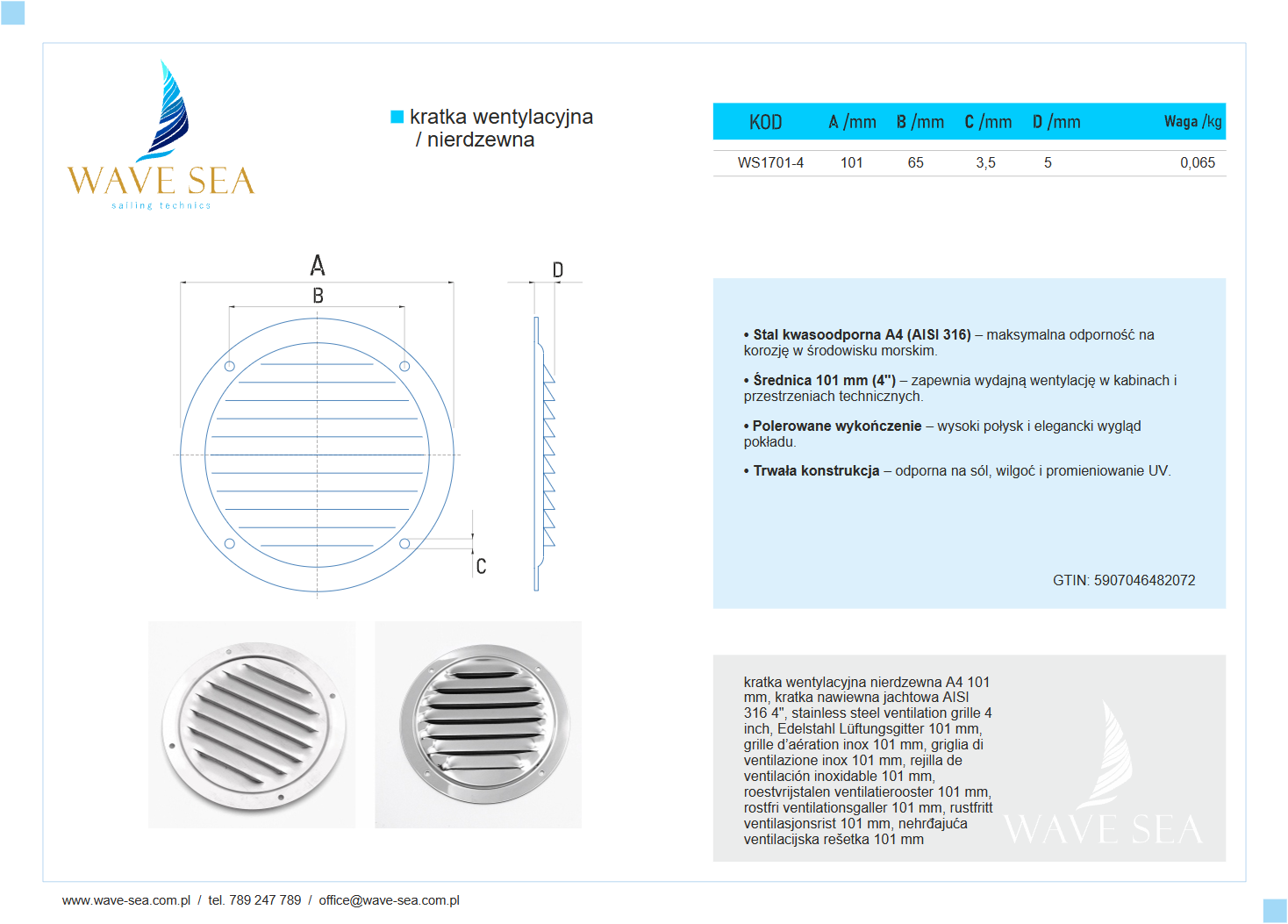 Kratka wentylacyjna kwasoodporna 4" 101 mm to połączenie funkcjonalności, estetyki i solidnego wykonania, które zapewnia skuteczną wentylację i stylowy wygląd jachtu. Wave Sea – solidność i precyzja wykonania.