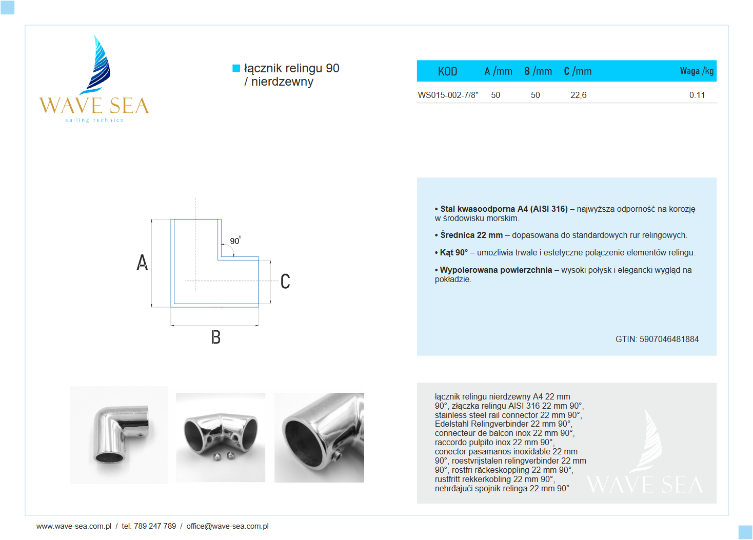 Łącznik relingu nierdzewny 22 mm 90° łączy precyzję wykonania, trwałość i estetykę, gwarantując solidne połączenie relingu w konstrukcjach jachtowych. Wave Sea – solidność i precyzja wykonania.