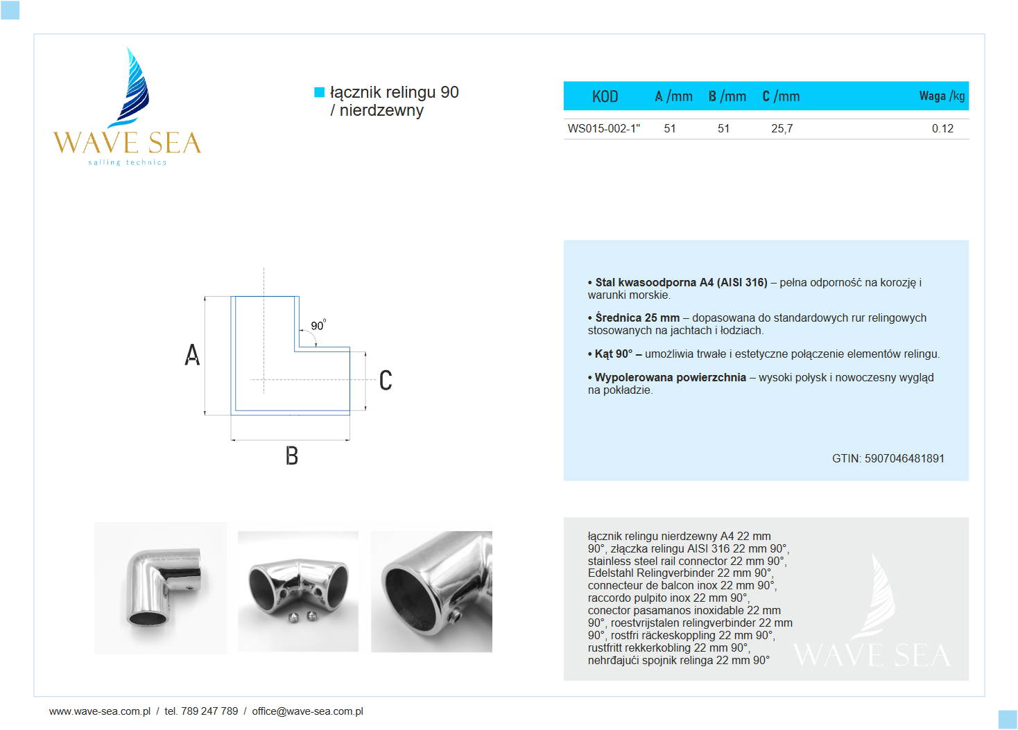 Łącznik relingu nierdzewny 25 mm 90° to połączenie trwałości, precyzji i estetyki, które zapewnia stabilność konstrukcji oraz elegancki wygląd relingu. Wave Sea – solidność i precyzja wykonania.