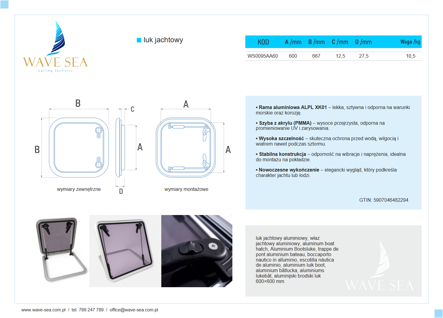 Luk jachtowy aluminiowy 60x60 cm to połączenie imponującej wytrzymałości, eleganckiego wzornictwa i europejskiej jakości potwierdzonej certyfikatem. Wave Sea – solidność i precyzja wykonania.