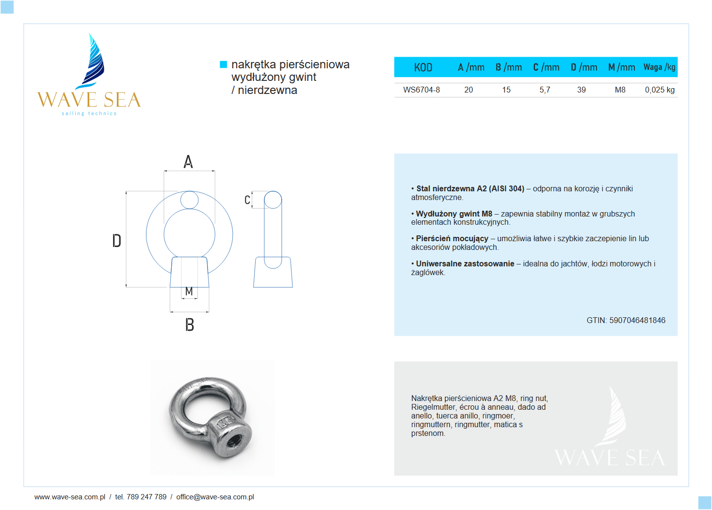 Nakrętka pierścieniowa A2 z wydłużonym gwintem M8 to połączenie solidności, funkcjonalności i estetyki, które gwarantuje niezawodne działanie w warunkach portowych i pokładowych. Wave Sea – solidność i precyzja wykonania.