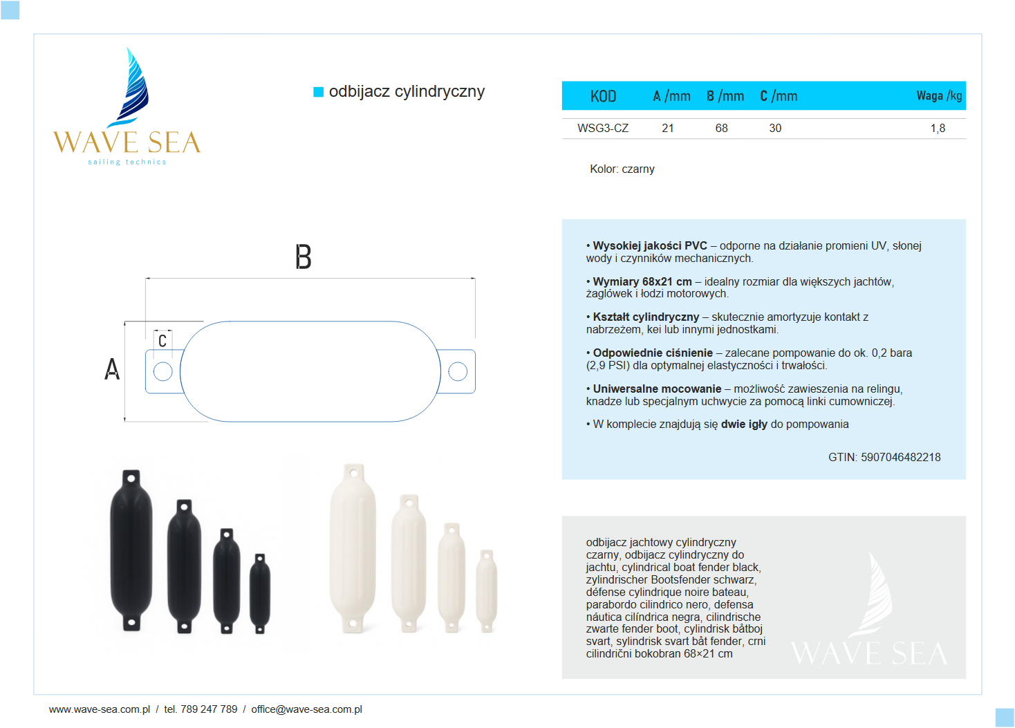 Odbijacz jachtowy cylindryczny 68x21 cm czarny to połączenie nowoczesnego wyglądu, niezawodnej ochrony i solidnego wykonania – idealny wybór dla wymagających żeglarzy. Wave Sea – solidność i precyzja wykonania.