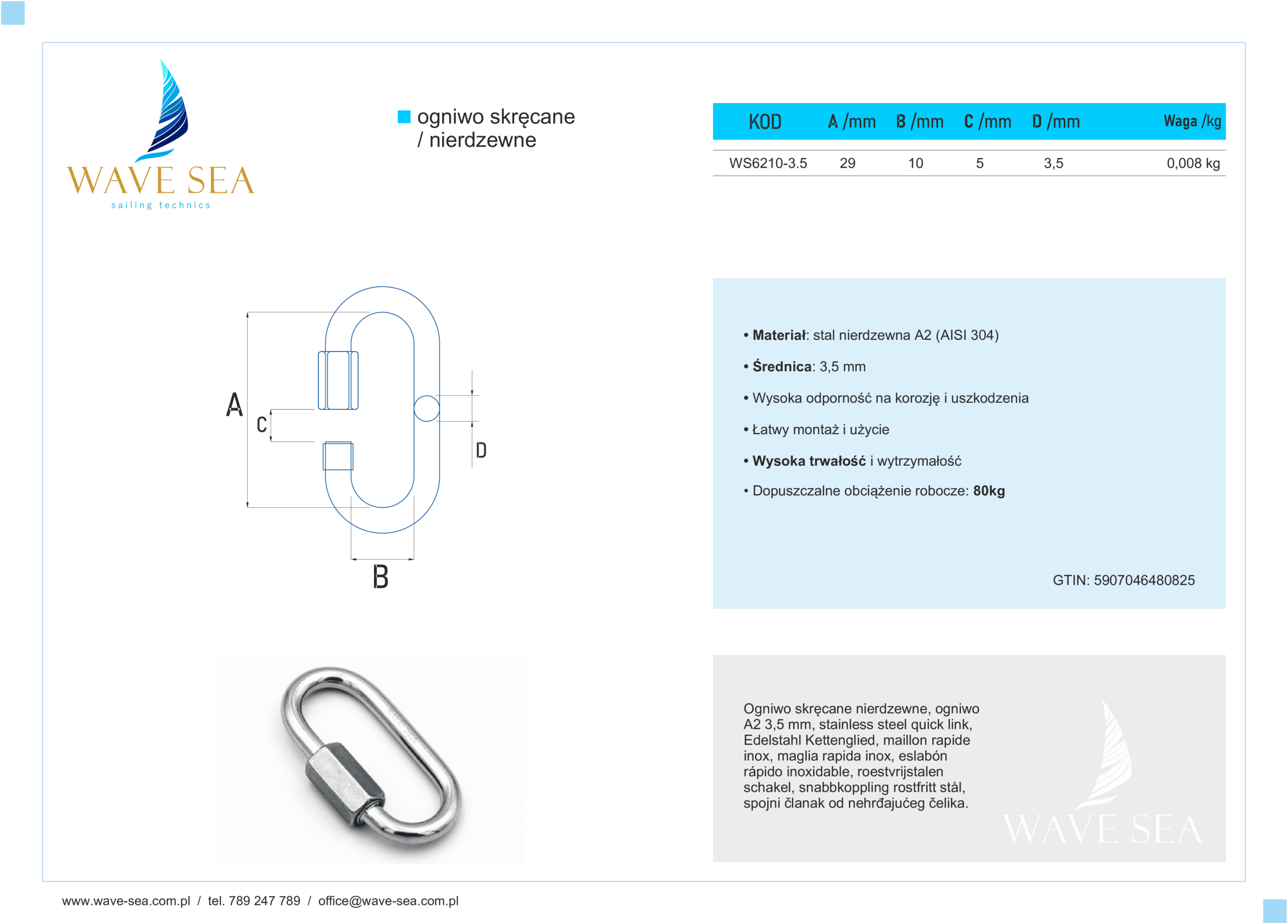 Ogniwo skręcane o średnicy 3,5 mm to niezawodny element, który zapewnia bezpieczne połączenia w systemach cumowniczych oraz linowych. Wykonane z wysokiej jakości stali nierdzewnej A2 (AISI 304), charakteryzuje się odpornością na działanie warunków atmosferycznych, co zapewnia długotrwałą niezawodność. Idealne do użytku w wodzie słodkiej, sprawdzi się w różnych zastosowaniach na Twoim jachcie.