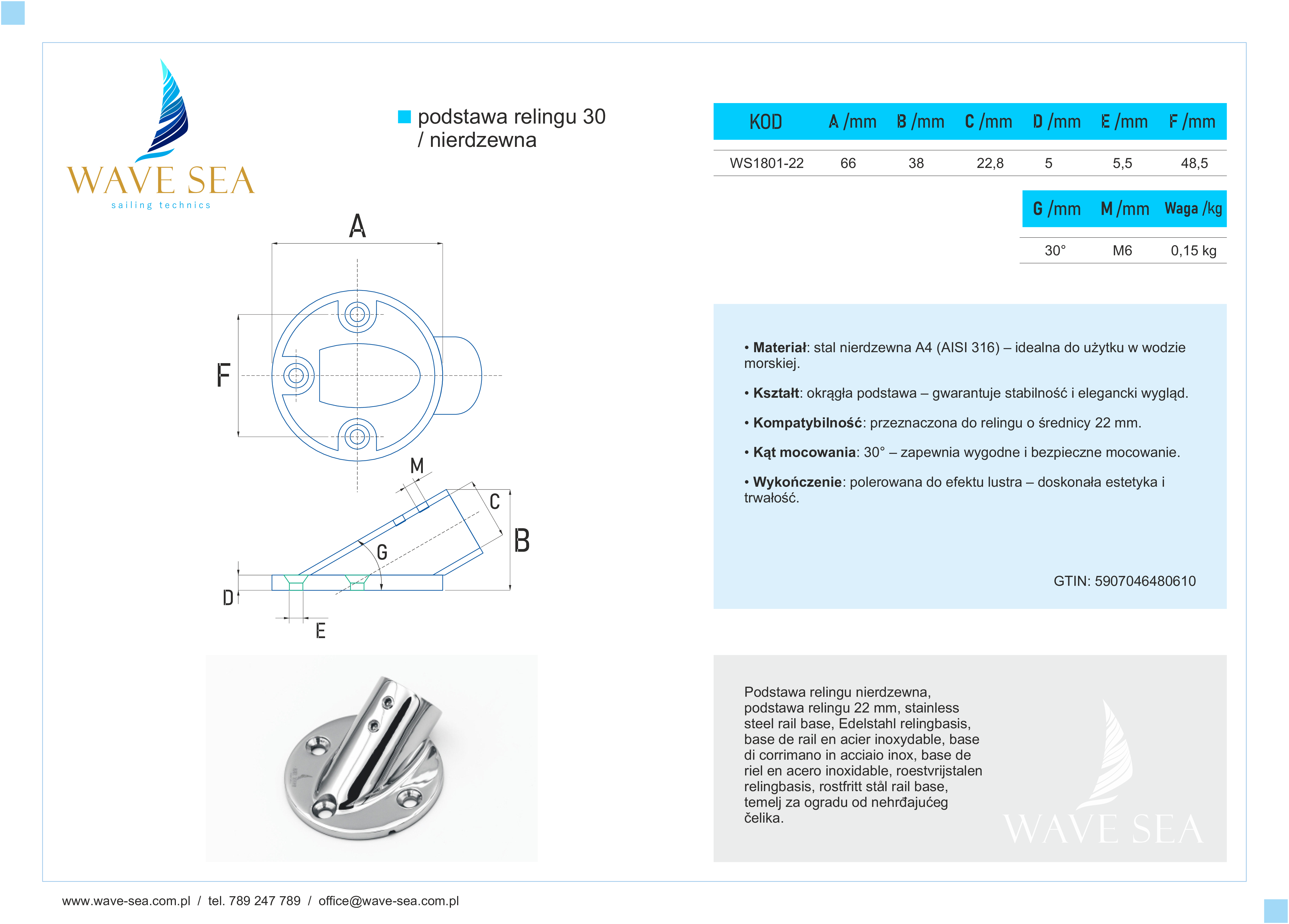 Podstawa relingu okrągła 22 mm 30° zapewnia solidne mocowanie relingu o średnicy 22 mm do pokładu łodzi. Dzięki kątowi 30°, reling jest zamocowany w optymalnej pozycji, co zapewnia wygodę i bezpieczeństwo podczas użytkowania. Montaż jest prosty – wystarczy przykręcić podstawę do powierzchni pokładu (wkręty nie są dołączone), a następnie wsunąć reling i zabezpieczyć go w uchwycie.