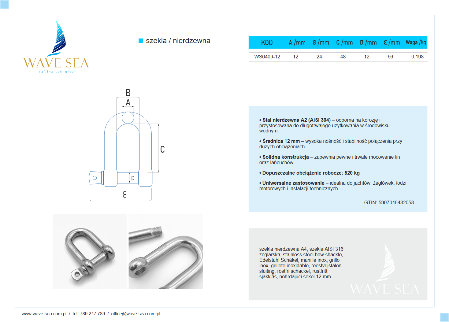 Szekla nierdzewna 12 mm to solidny element osprzętu jachtowego, przeznaczony do łączenia lin, łańcuchów oraz elementów mocujących w miejscach wymagających wysokiej nośności. Wykonana ze stali nierdzewnej A2 (AISI 304), gwarantuje odporność na korozję oraz długą żywotność nawet w trudnych warunkach portowych. Dzięki swojej masywnej konstrukcji, szekla 12 mm zapewnia niezawodne i bezpieczne mocowanie w systemach cumowniczych, asekuracyjnych i technicznych.