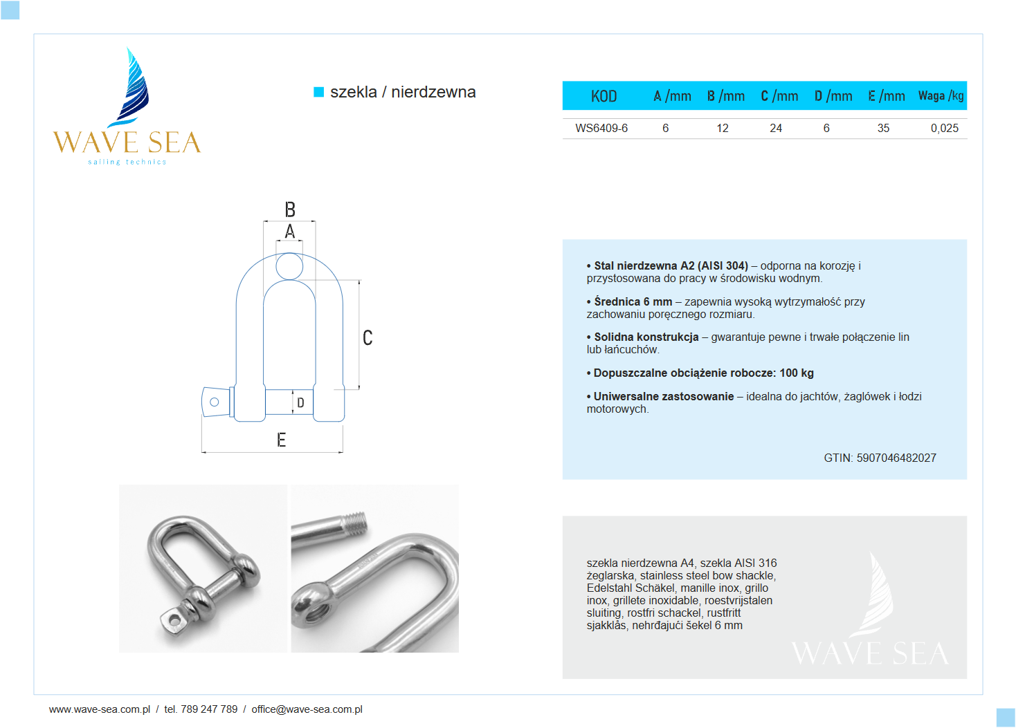 Szekla nierdzewna 6 mm to wytrzymały element osprzętu jachtowego, przeznaczony do łączenia lin, łańcuchów, karabińczyków oraz innych akcesoriów pokładowych. Wykonana ze stali nierdzewnej A2 (AISI 304), zapewnia odporność na korozję i niezawodność w warunkach śródlądowych i portowych. Dzięki precyzyjnemu wykonaniu i kompaktowym rozmiarom, szekla 6 mm gwarantuje stabilne, pewne i bezpieczne połączenie w codziennym użytkowaniu.