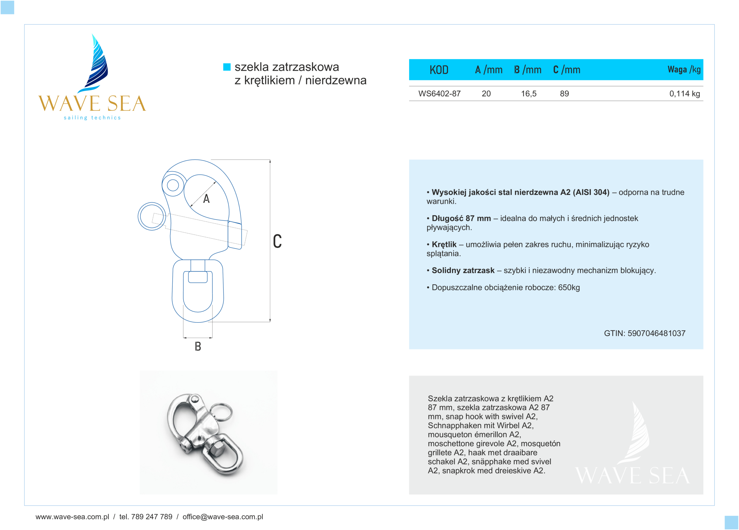 Zintegrowany krętlik umożliwia pełny obrót pod obciążeniem, zapobiegając skręcaniu lin i zwiększając stabilność systemu. Zatrzask mechaniczny pozwala na szybkie i pewne łączenie, co przyspiesza pracę w wymagających warunkach. Szekla zatrzaskowa z krętlikiem nierdzewna A2 87 mm została wykonana z wysokiej jakości stali nierdzewnej A2 (AISI 304), co zapewnia trwałość i odporność na korozję w środowisku słodkowodnym.