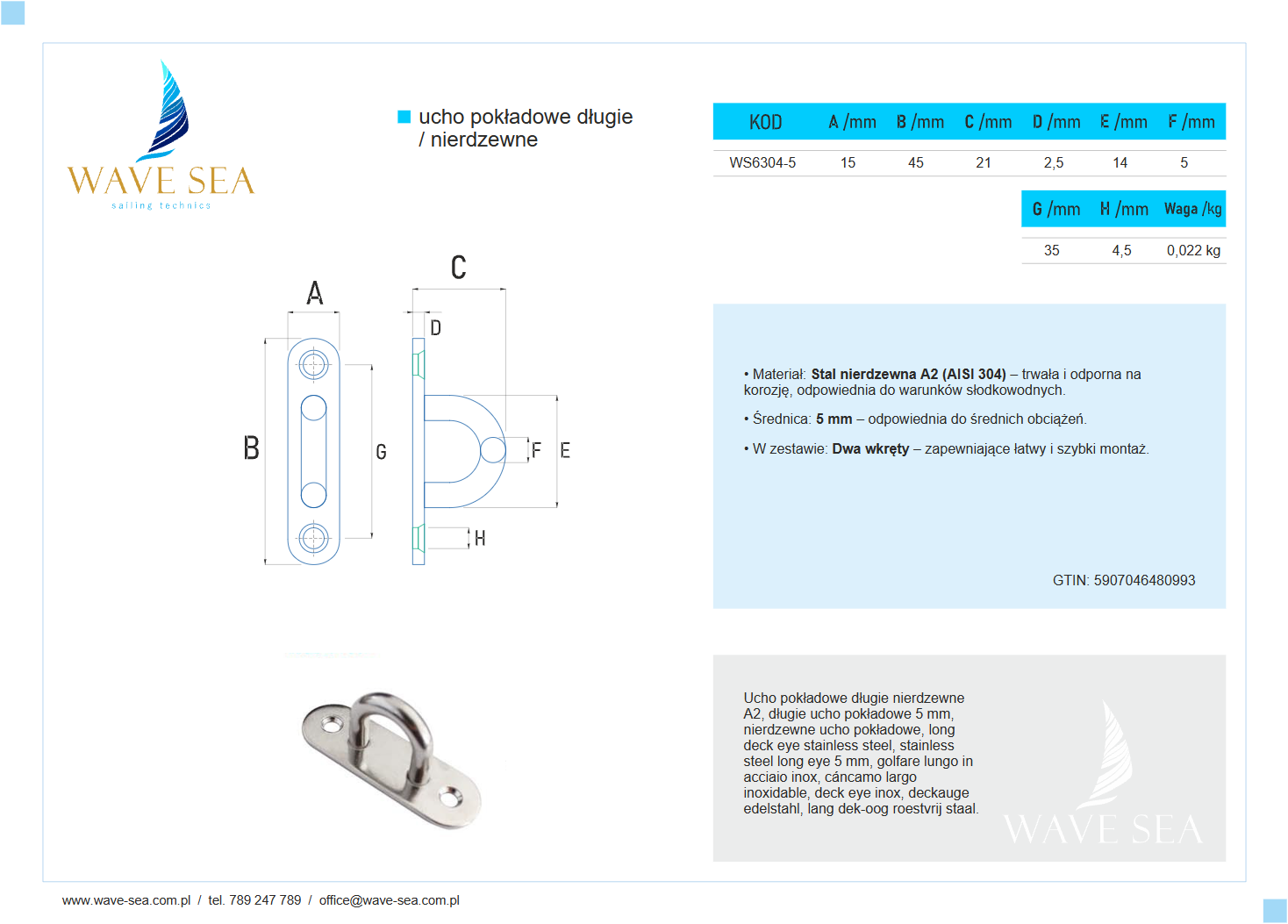 Ucho pokładowe długie nierdzewne A2 5 mm to solidne rozwiązanie do mocowania lin i innych akcesoriów na pokładzie Twojego jachtu. Wykonane z wysokiej jakości stali nierdzewnej A2 (AISI 304), gwarantuje odporność na rdzewienie i długotrwałe użytkowanie. Dzięki załączonym wkrętom, montaż staje się prosty i szybki, a solidność mocowania – pewna i niezawodna.