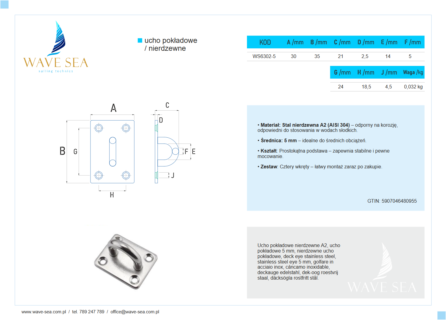Ucho pokładowe nierdzewne A2 5 mm to niezawodne rozwiązanie do mocowania lin, akcesoriów czy kotwic na pokładzie Twojego jachtu. Wykonane z wysokiej jakości stali nierdzewnej A2 (AISI 304), zapewnia trwałość i odporność na korozję, idealne do warunków słodkowodnych. Dzięki prostokątnej podstawie, ucho zapewnia stabilność mocowania, a cztery wkręty w zestawie ułatwiają szybki i bezproblemowy montaż.