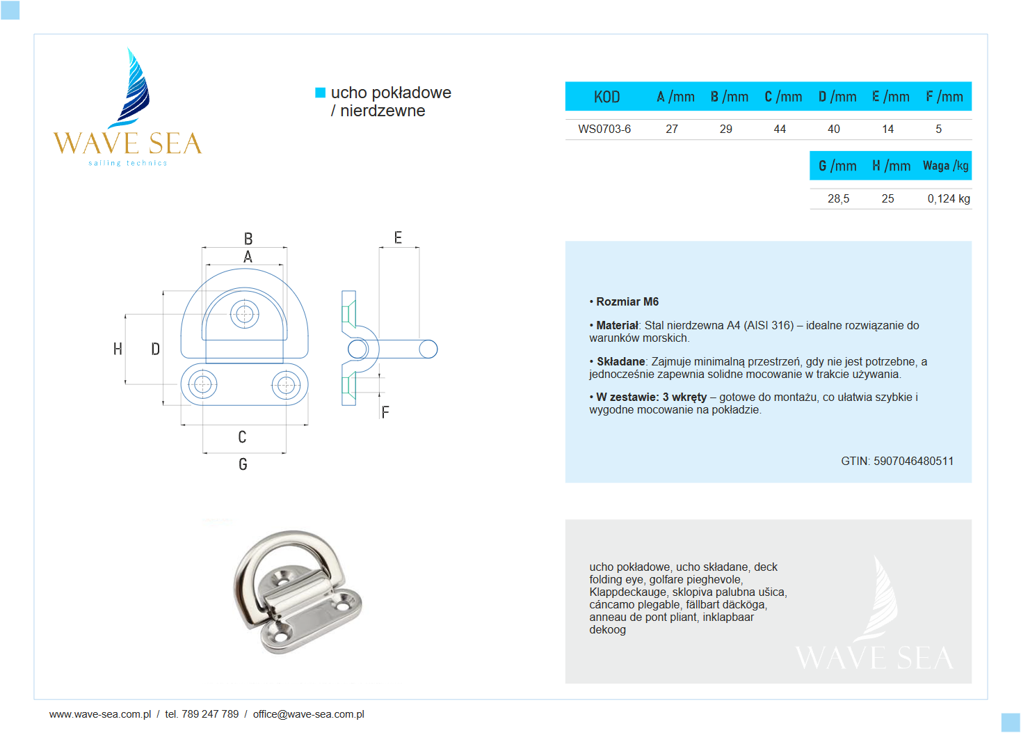 Ucho pokładowe składane nierdzewne A4 to wyjątkowo funkcjonalny element, który łączy niezawodność z oszczędnością przestrzeni. Wykonane z najwyższej jakości stali nierdzewnej A4 (AISI 316), zapewnia odporność na trudne warunki morskie, gwarantując długotrwałą trwałość w eksploatacji. Dzięki składanej konstrukcji, gdy nie jest używane, można je łatwo złożyć, co pozwala zaoszczędzić miejsce na pokładzie.