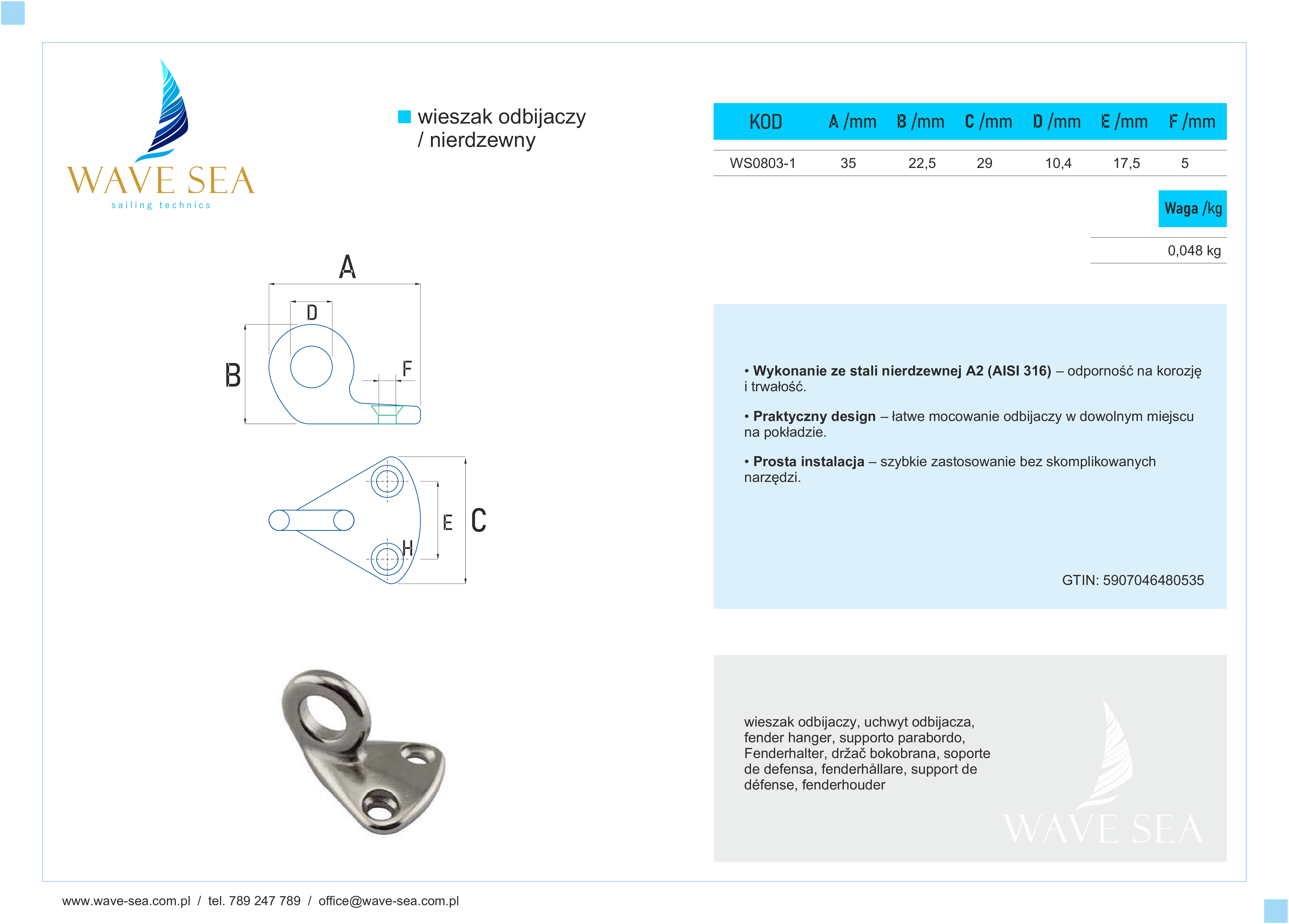 Wieszak odbijaczy nierdzewny A2 pozwala na łatwe zawieszanie odbijaczy, utrzymując je w idealnym miejscu, by skutecznie chroniły kadłub przed uszkodzeniami. Wykonany ze stali nierdzewnej A2 (AISI 304), jest odporny na działanie warunków atmosferycznych, co gwarantuje jego długotrwałą niezawodność.
