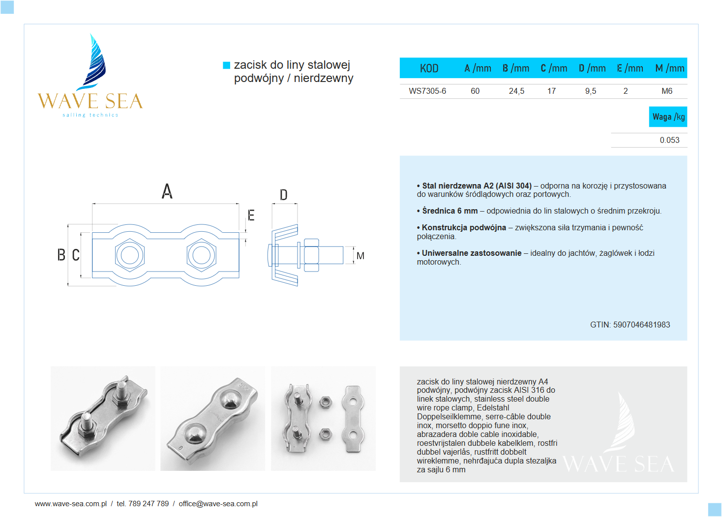Zacisk do liny stalowej podwójny nierdzewny 6 mm łączy w sobie trwałość, funkcjonalność i precyzyjne wykonanie, gwarantując niezawodne działanie w każdych warunkach. Wave Sea – solidność i precyzja wykonania.