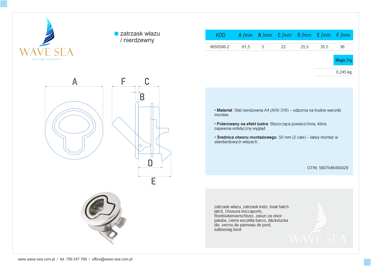 Zatrzask włazu łodzi nierdzewny A4 2" to solidne i estetyczne rozwiązanie, które zapewnia pewne zamknięcie włazów w trudnych warunkach morskich. Wykonany z wysokiej jakości stali nierdzewnej A4 (AISI 316), jest odporny na korozję i wpływ wody morskiej, co czyni go idealnym wyborem do zastosowań na jachtach i łodziach. Polerowana na efekt lustra powierzchnia nadaje mu elegancki wygląd, a precyzyjne wymiary gwarantują doskonałe dopasowanie.
