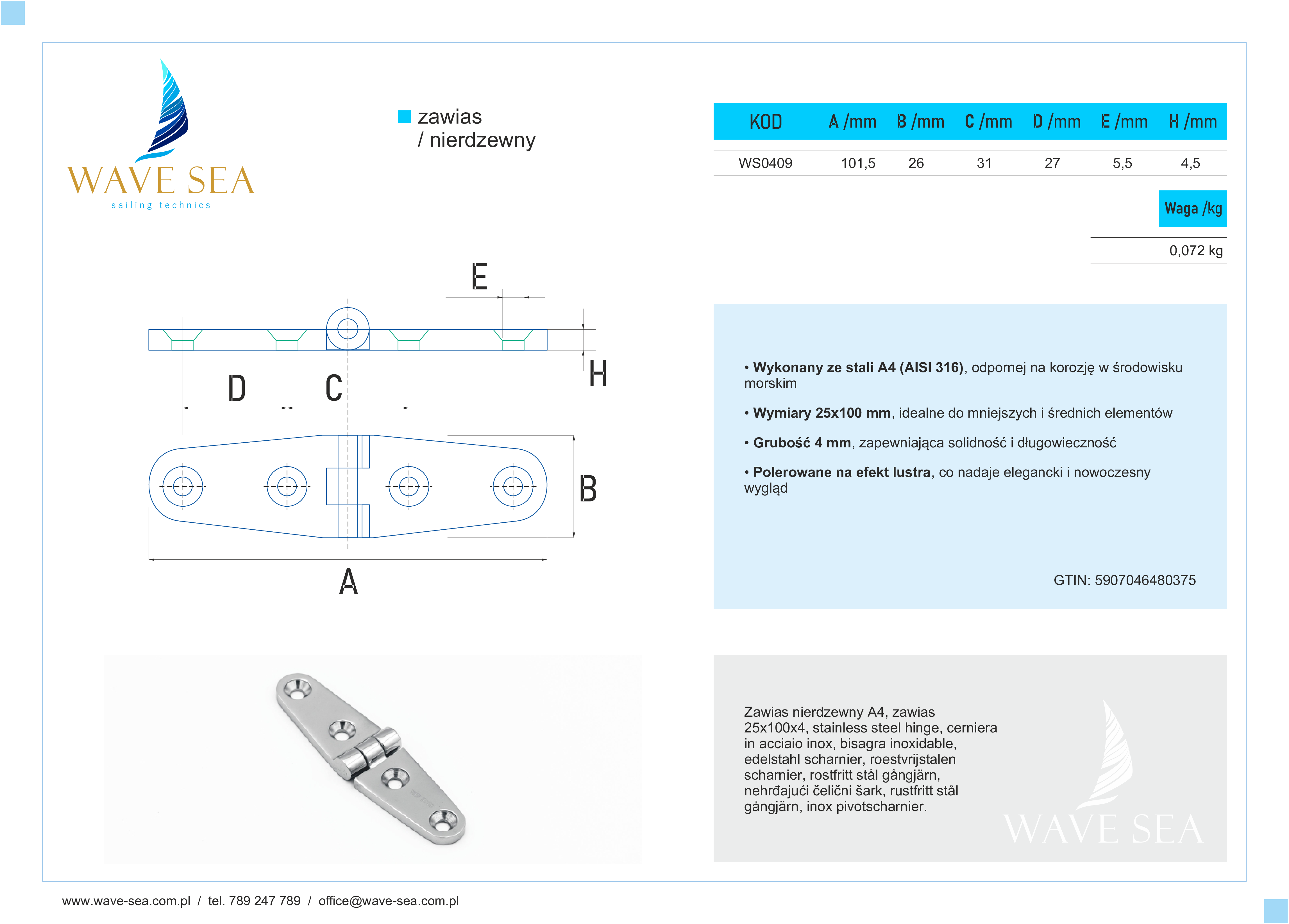 Zawias nierdzewny A4 – 25x100x4 to wysokiej jakości element, który zapewnia niezawodność i estetykę w trudnych warunkach morskich. Wykonany z stali nierdzewnej A4 (AISI 316), zawias charakteryzuje się doskonałą odpornością na korozję, co czyni go idealnym wyborem do użytku w wodzie morskiej. Zawias nierdzewny A4 – 25x100x4 ma wymiary 25x100 mm i grubość 4 mm, co gwarantuje solidność i trwałość połączeń. Polerowana powierzchnia na efekt lustra nadaje mu elegancki, nowoczesny wygląd, który doskonale komponuje się z nowoczesnymi jachtami i łodziami.