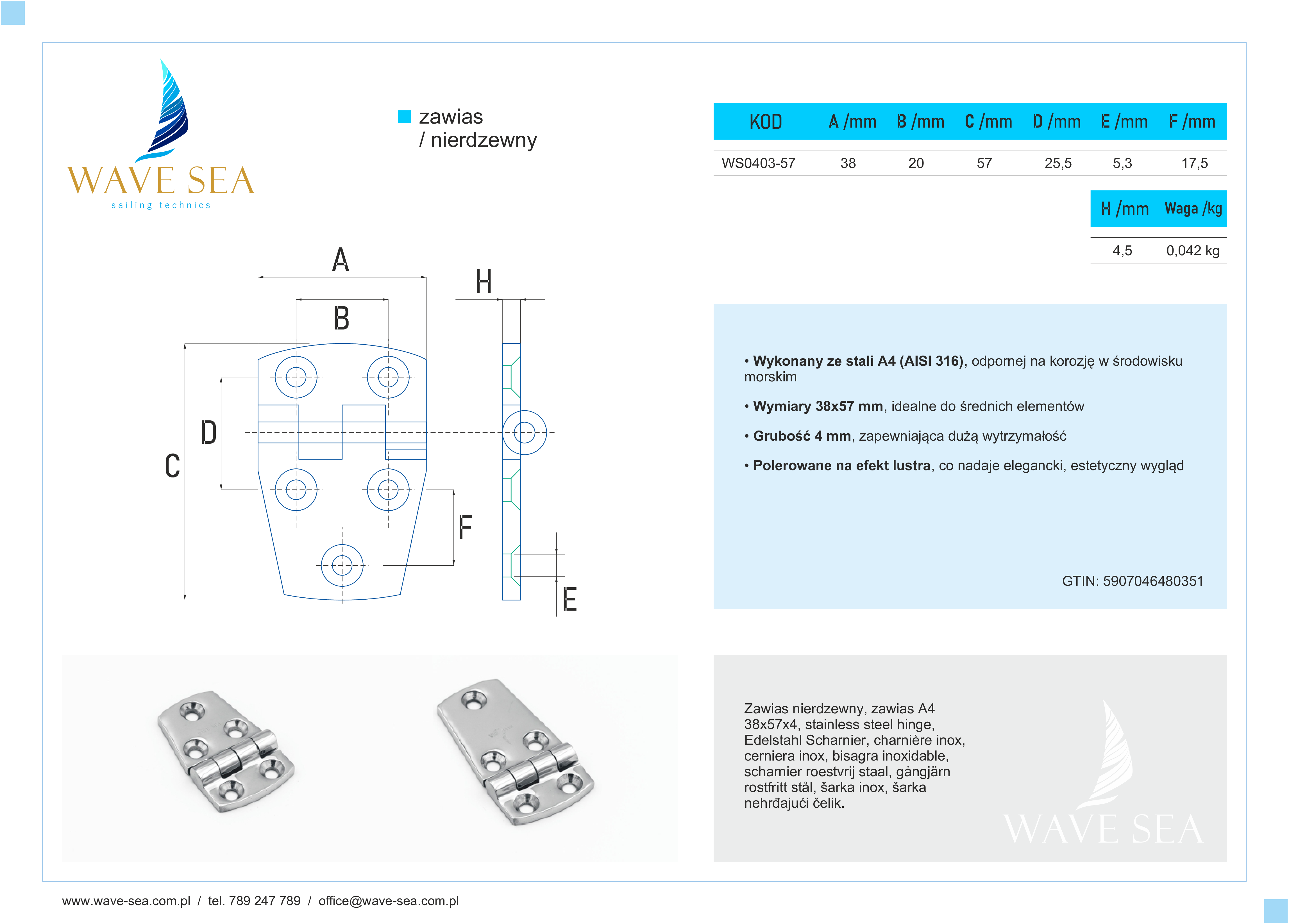 Zawias nierdzewny A4 – 38x57x4 to niezastąpiony element, który gwarantuje długotrwałe użytkowanie, odporność na trudne warunki morskie oraz estetyczny wygląd, spełniając wysokie standardy jakości.